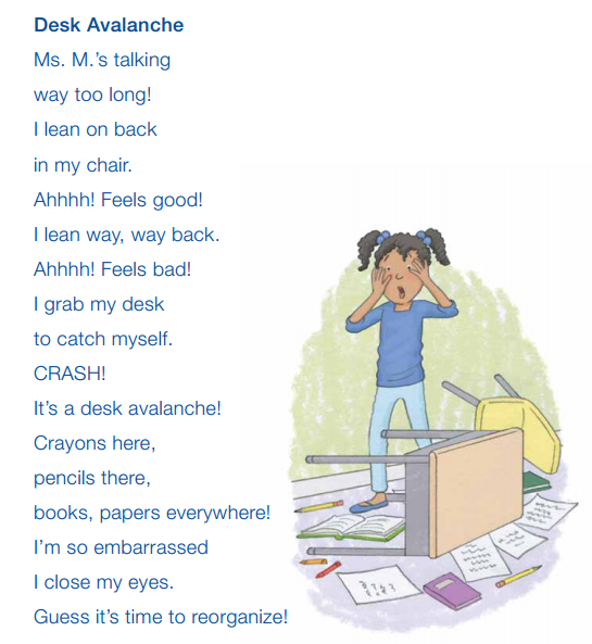 Stella’s class experiences the outdoors and learns just how powerful words can be. Another thing the class learns is that anything can become the topic of a poem. ย Stella’s friend accidentally topples her desk, and so the class writes the poem,ย Desk Avalancheย below. (I bet a few classroom teachers will relate to this experience!) A messy classroom, a family pet, or maybe a cooking disaster could be your students’ next masterpiece.