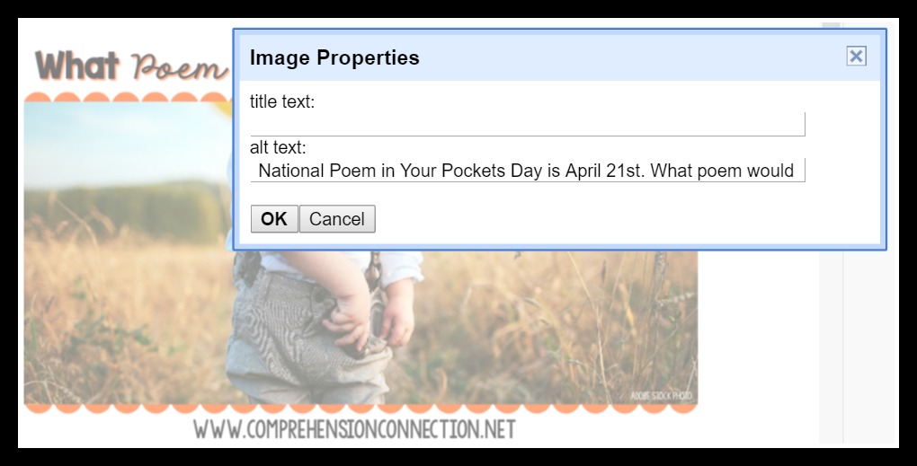 After you insert the image, you will need to take care of a few more steps. It’s very important that you always take care of the image properties. Search engines can’t read images, so you need to address the properties. For Blogger, you’ll click the gear icon and add the Alt Text and Title. In Word Press, you need an image plug in like Grow or Tasty Pins.