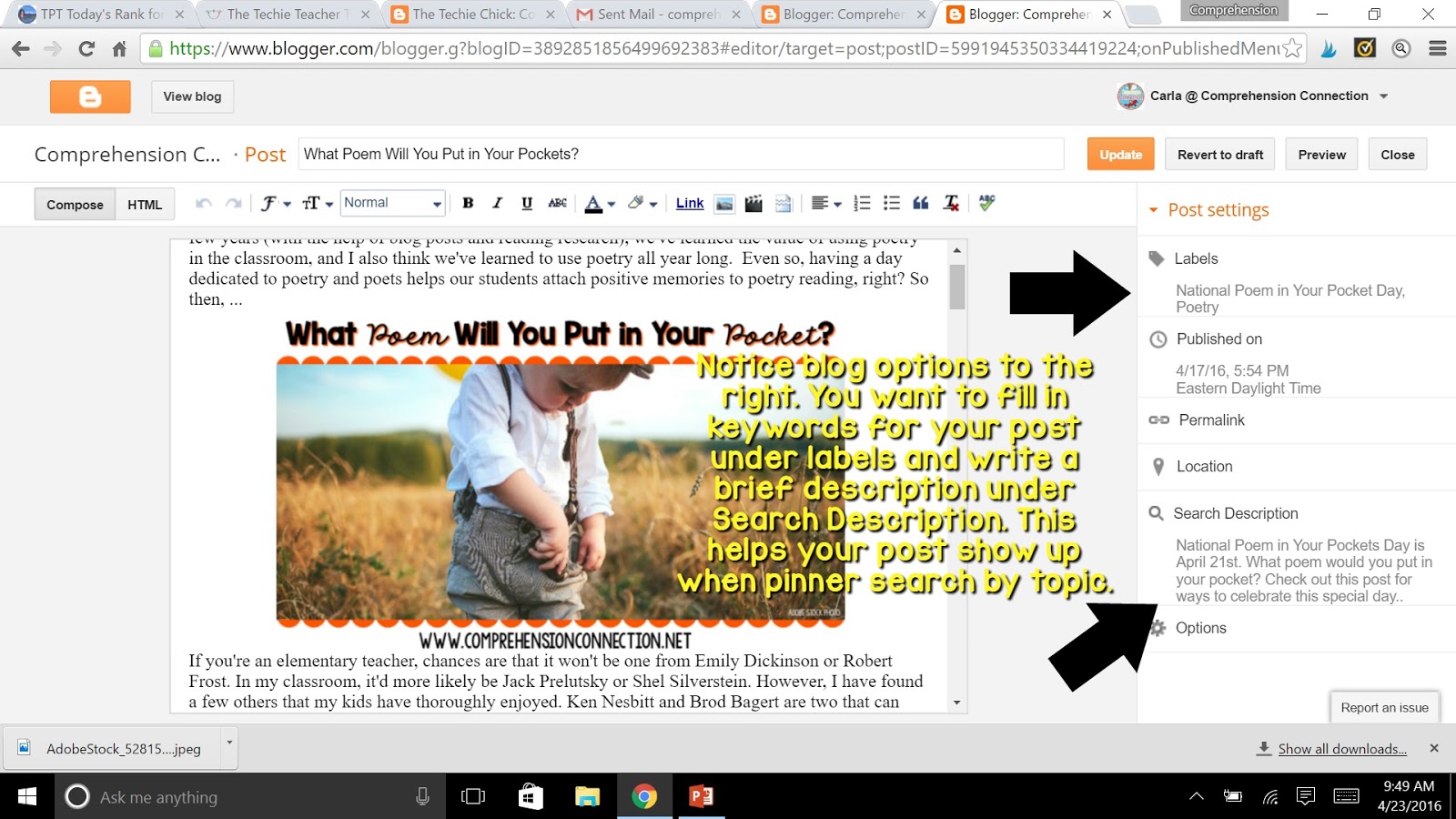 In addition to images, it’s also important to remember to add the meta data information. With Blogger, this is the search description. In Word Press, it’s called the meta description. Write a few sentences (under 150 words) to summarize your post. Be sure your key words are used.