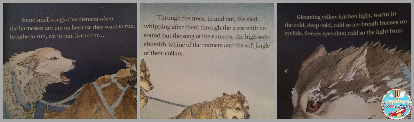 I like to begin every mentor text lesson with a schema builder that generates conversation between my students or that builds background for topics that my students may or may not be familiar with. With this text, the teacher might enjoy showing a clip about the Iditarod like this one from Youtube.