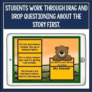 Each digital task card has full audio support. Students respond (drag and drop activities) to comprehension questions, sequence the events of the story (2), identify the story elements, sort cause and effect events, and extended responses.
