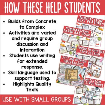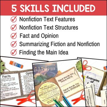 Students learn key skills including nonfiction text features, text structures, fact and opinion, main idea, and summarizing nonfiction which they can use with any nonfiction book. Students use the first 4-5 pages for learning about each nonfiction skill. Then, they pull the information together, practice reading various texts, sort examples and nonexamples, complete graphic organizers, and work with small group. Finally, each book includes independent work activities for application. Again, you can use the pages in the book as displayed or in your interactive notebooks. The books also work well in small groups and as a pair/share activity.